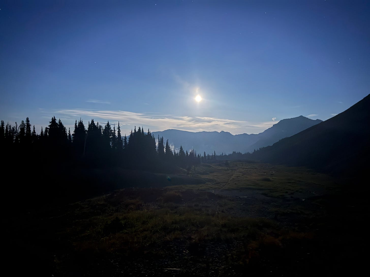 We started to descend the ridgeline below, called “Knife’s Edge,” as the sun dipped behind the clouds. Shortly thereafter, a full moon rose exactly opposite the sun, illuminating the breathtaking terrain into the night. As we walked our final few miles into camp I turned and captured Mo’s face as he looked up at the sunset. Speechless until he mustered up a prolonged “wooow,” all I could think was “this is exactly why we do it.” We go through the slog day in and day out to put ourselves in a position to witness the sun, moon, stars, clouds, and mountains putting their best on display in perfect harmony. To be humbled by a collation of natural beauty whose whole is undoubtedly better than the sum of its parts.