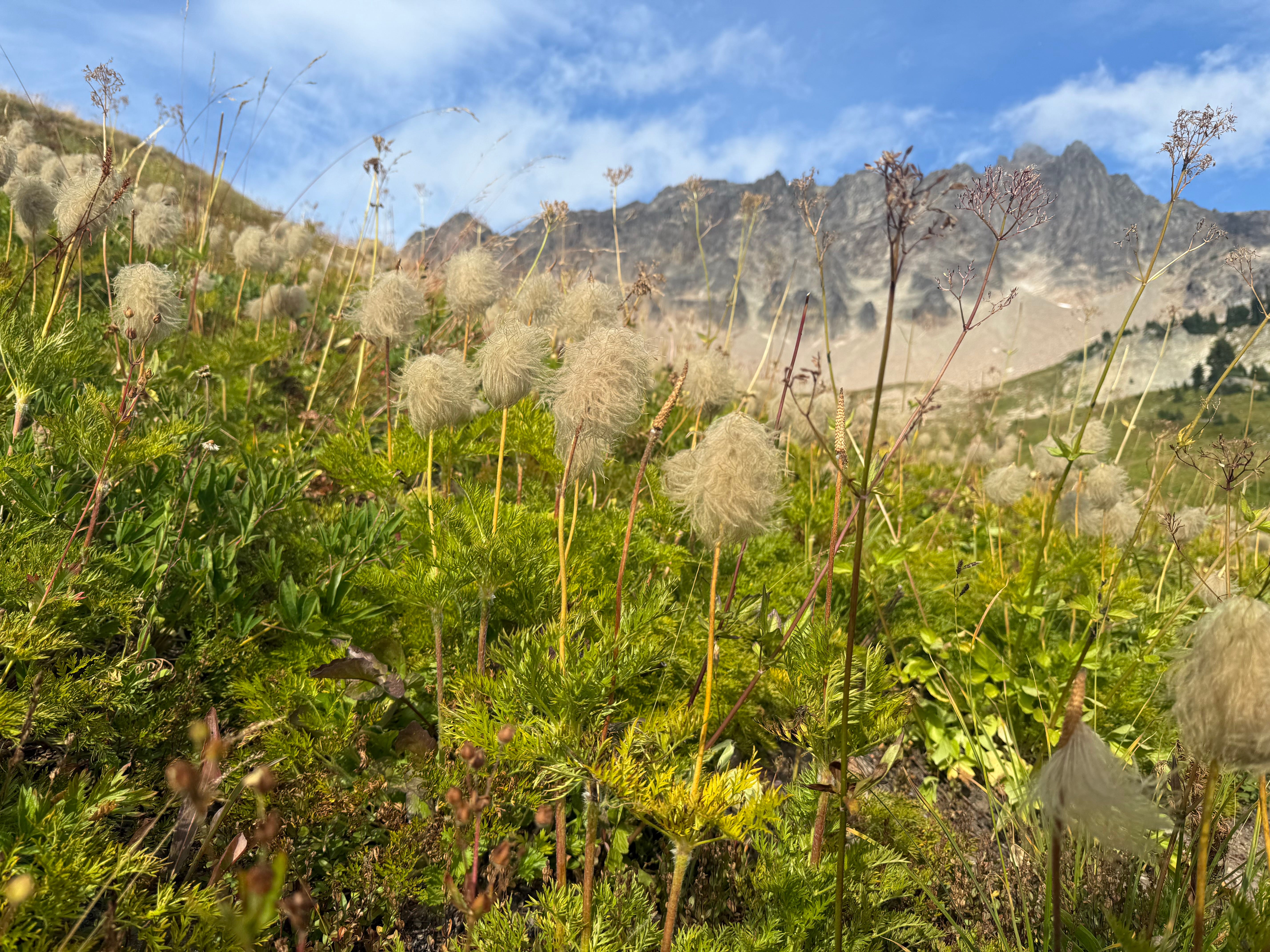 The ensuing stretch from Trout Lake to White Pass took us through the Goat Rocks Wilderness, which we all agreed produced a top three day on the PCT. First, we came upon the sheer wall of rock jutting up from the fog for which the area is named. Rolling green hills descended from their base into valleys that extended as far as we could see. A couple dozen mountain goats grazed lazily on the wild grasses. Up close, the landscape was dotted with Western Pasqueflowers, whose tips are wispy, villous hairs that look like mini Truffula trees, adding to the majesty of the environment. As we climbed, we got more unblemished views of Mt. Adams, this time from the other side after traversing it the day before.