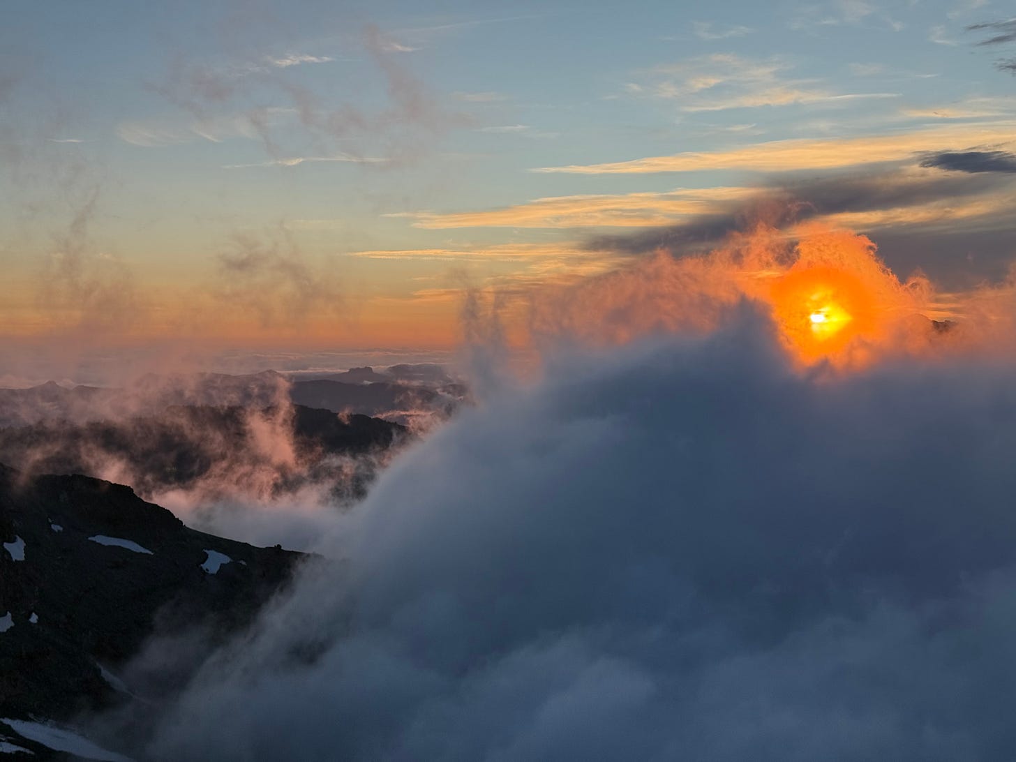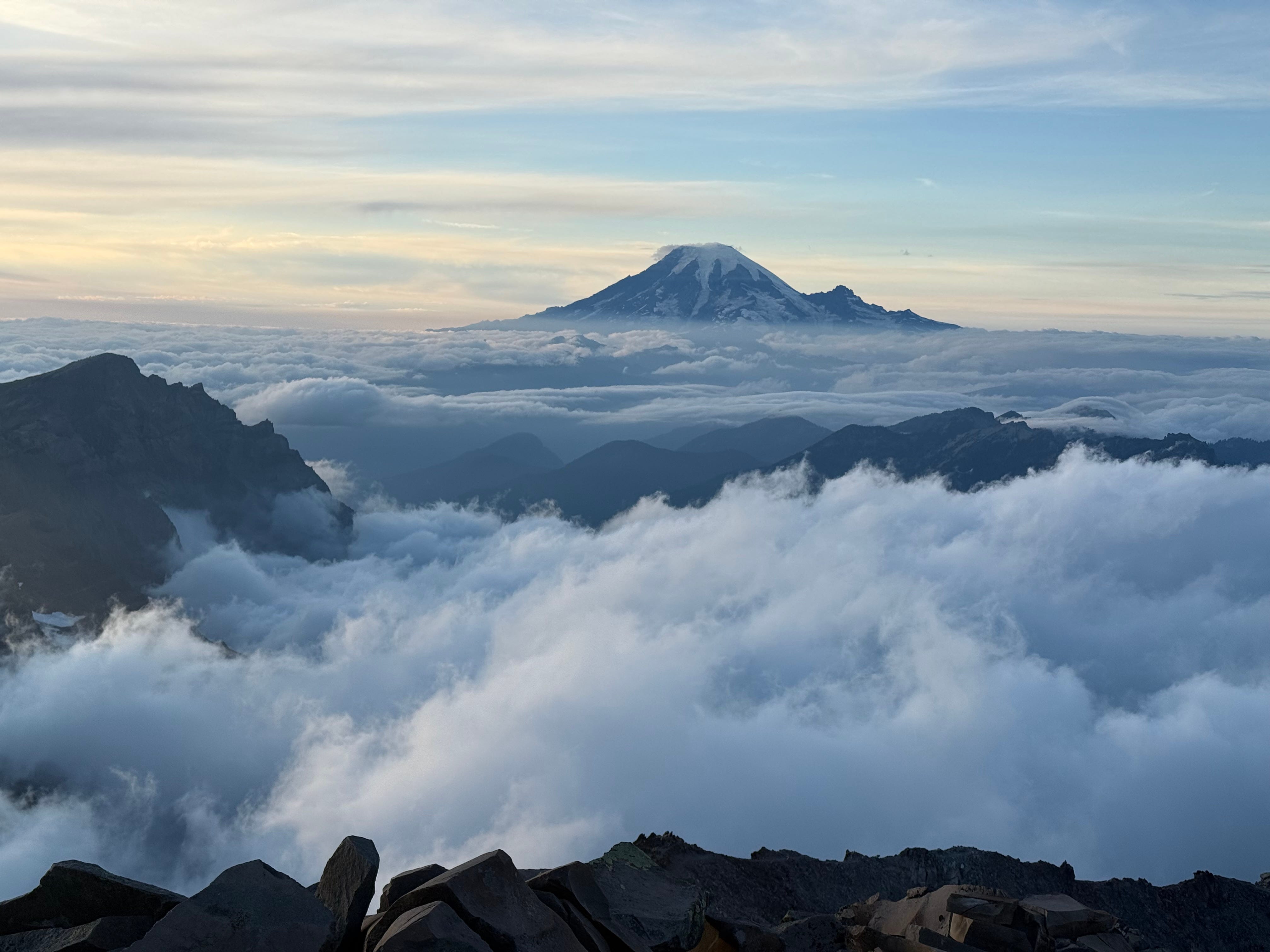 After a brief rock scramble, we summited Old Snowy (7,880’) just as the sun began to lower in the sky. From there we saw the Goat Rocks, Mt. Adams (12,281’), Mt. St. Helens (8,366’), and Mt. Rainier (14,441’) all within a 360 degree panorama. As we took in the stunning view, the clouds continued to saunter in below and shortly thereafter only the four peaks mentioned were visible above the clouds. It made it feel like we were 30,000 feet in the air and it might as well have been the top of the world.