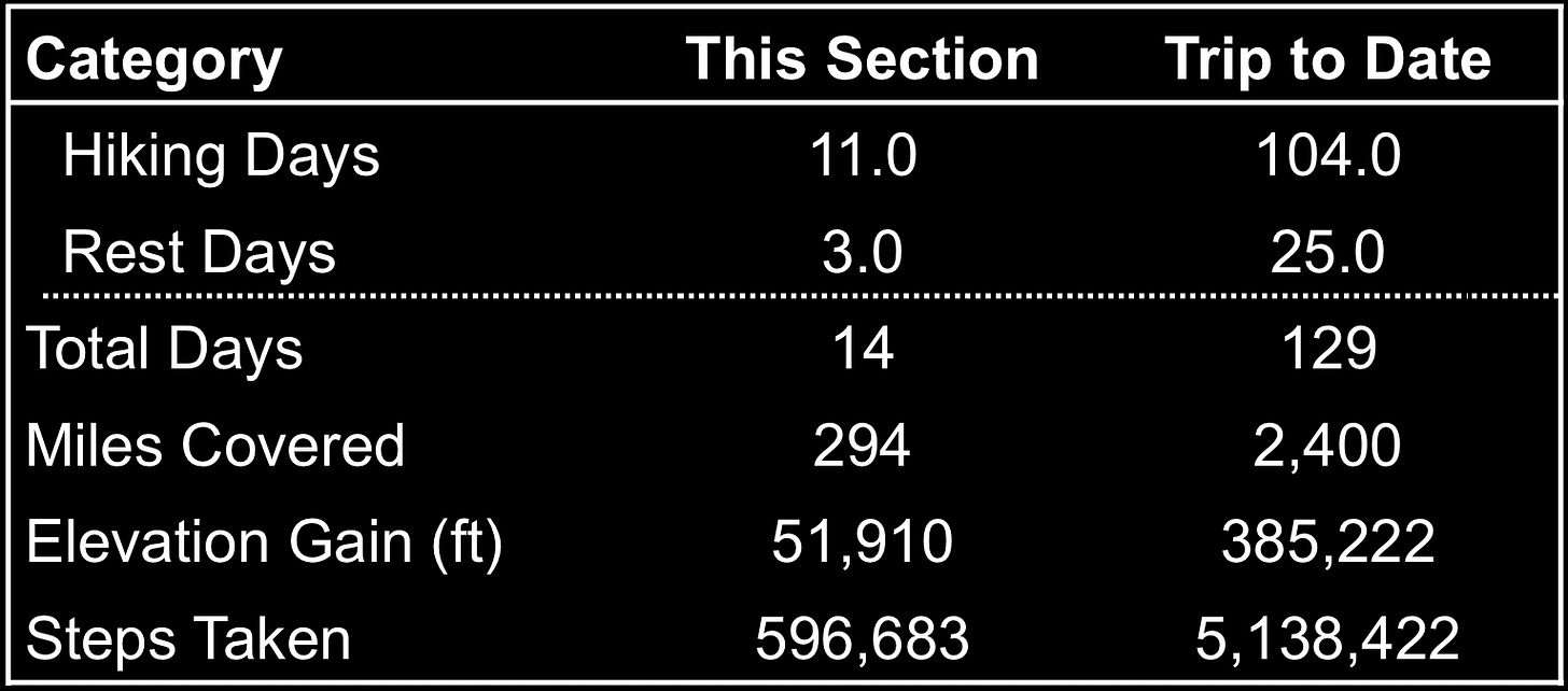 Ms. Elegant started her thru hike in 2006, 19 seasons ago. Each year since she has made her way little by little, having completed 2,070 miles by the time we crossed paths. One of the grand ironies of the sport is that going slower is often more difficult than breezing through. Ms. Elegant has to carry an excess of food and water, making her pack massive, probably never weighing less than 1/3 of her body weight. She’s only capable of single-digit mileage every day and yet she continues along. “So few people in this world actually do it, so few people are able to see what we see…how could I not?” she said in reflection.