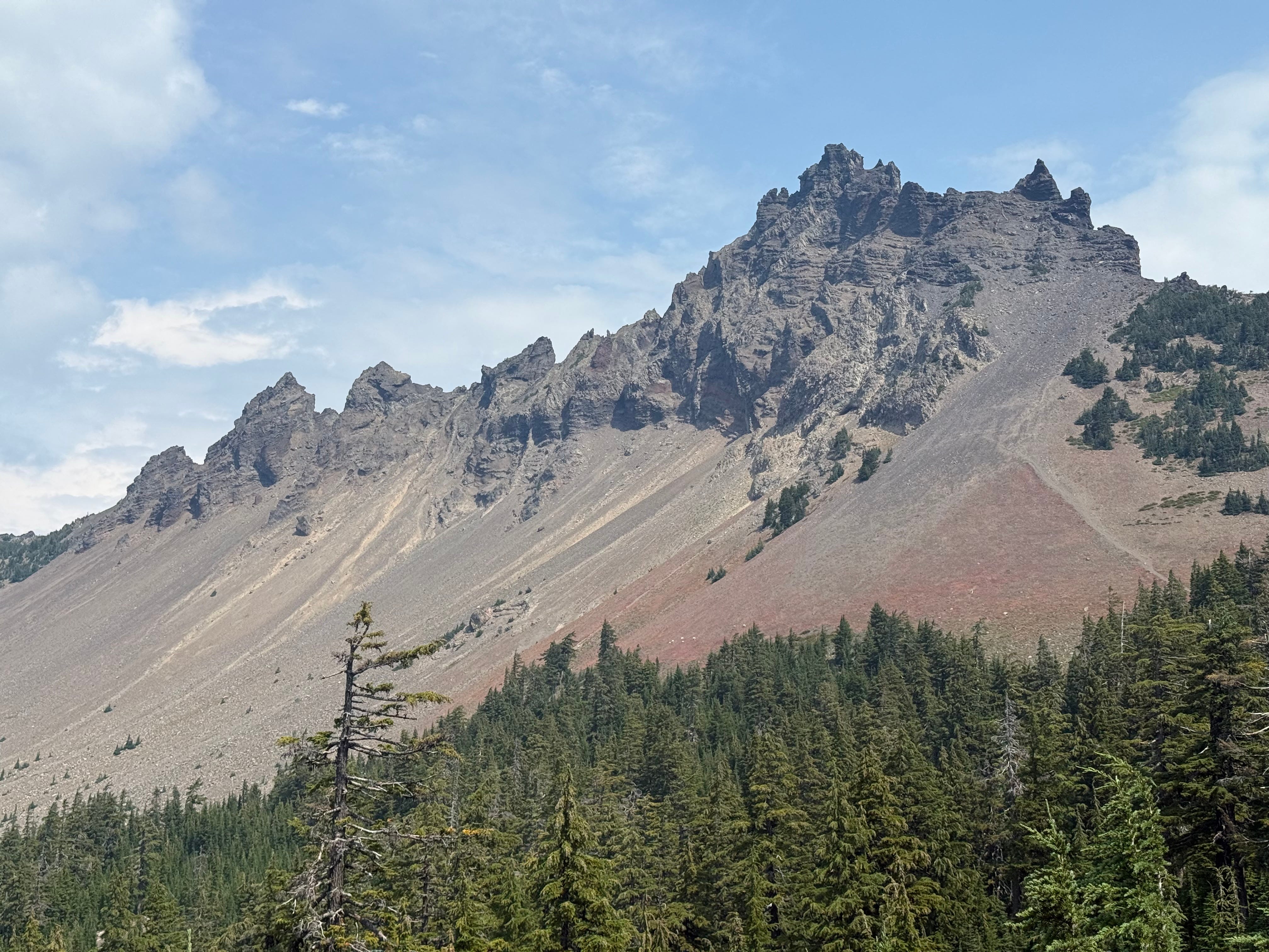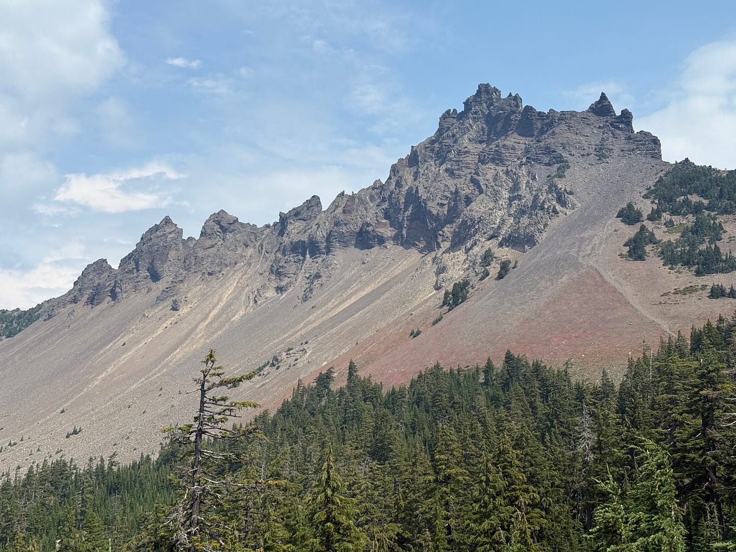 Our trip began out of Bend with a couple of highlight rock formations. First, we passed by the Three Fingered Jack which fittingly juts above the lava rock as a trio of craggy digits. Along its base were half a dozen mountain goats, which you can barely make out as white blobs in the photo below. The second were the ever intensifying views of Mt. Jefferson which we eventually climbed to and hiked around as streams of snow melt gushed down throughout the afternoon.