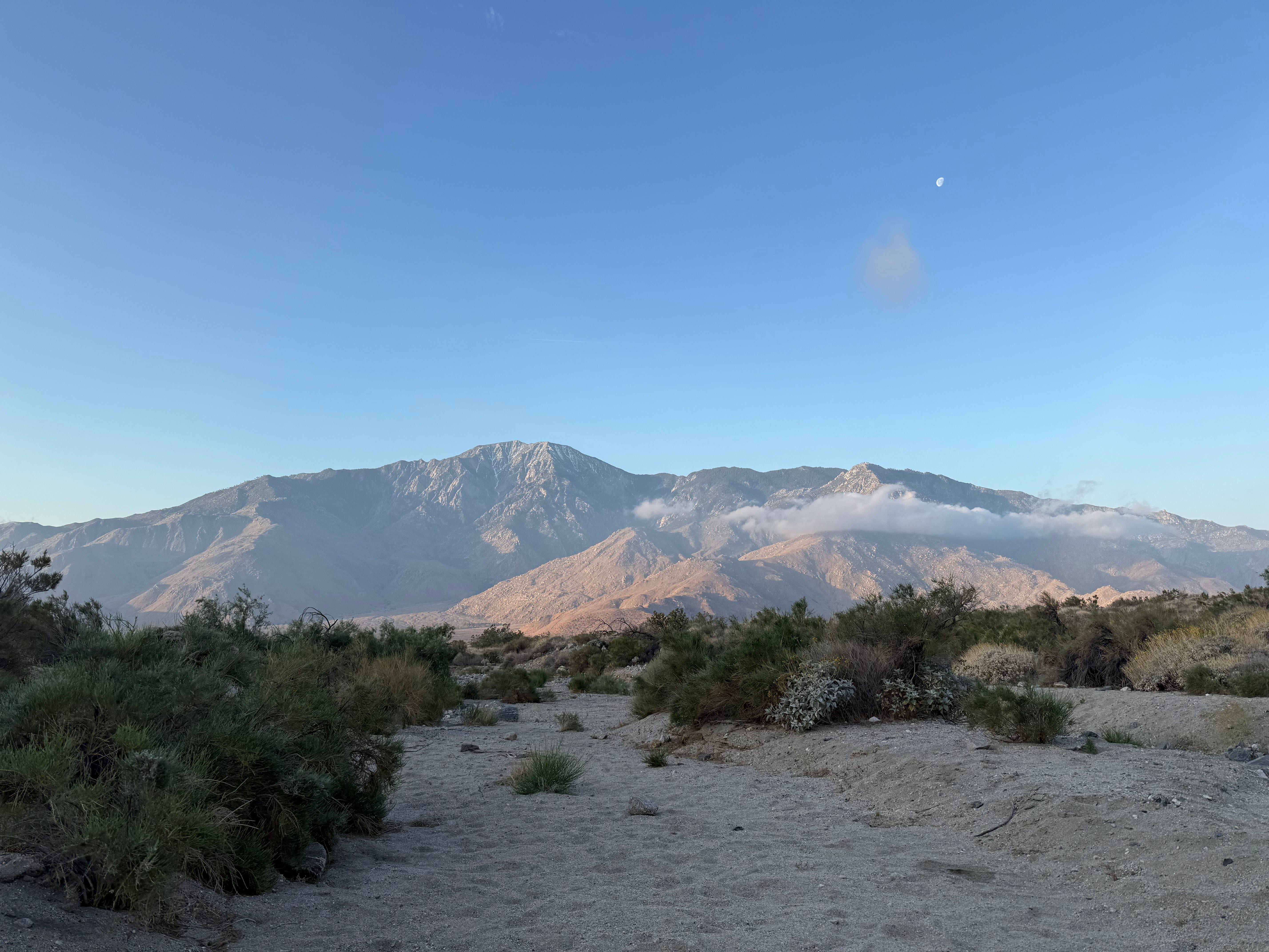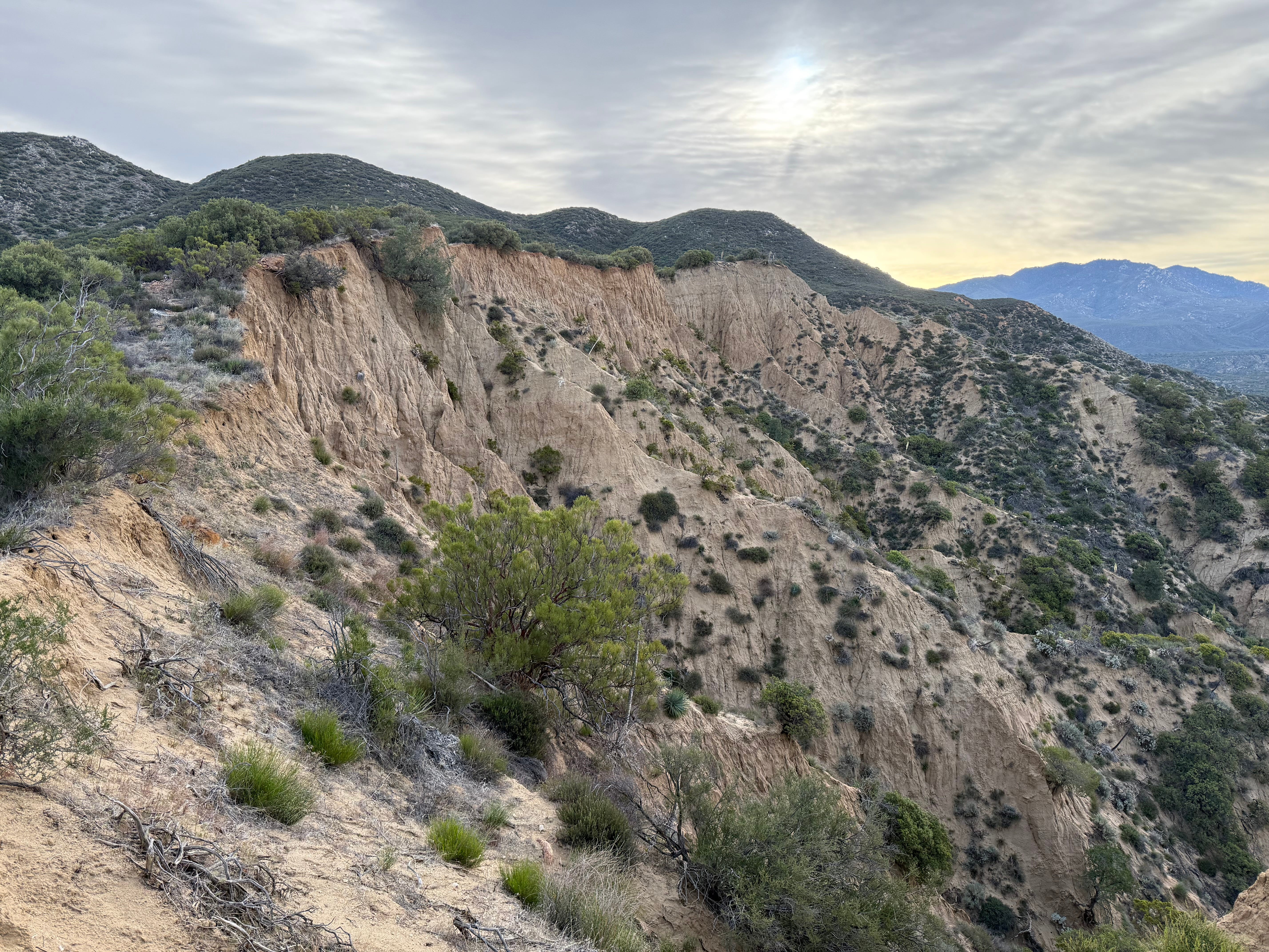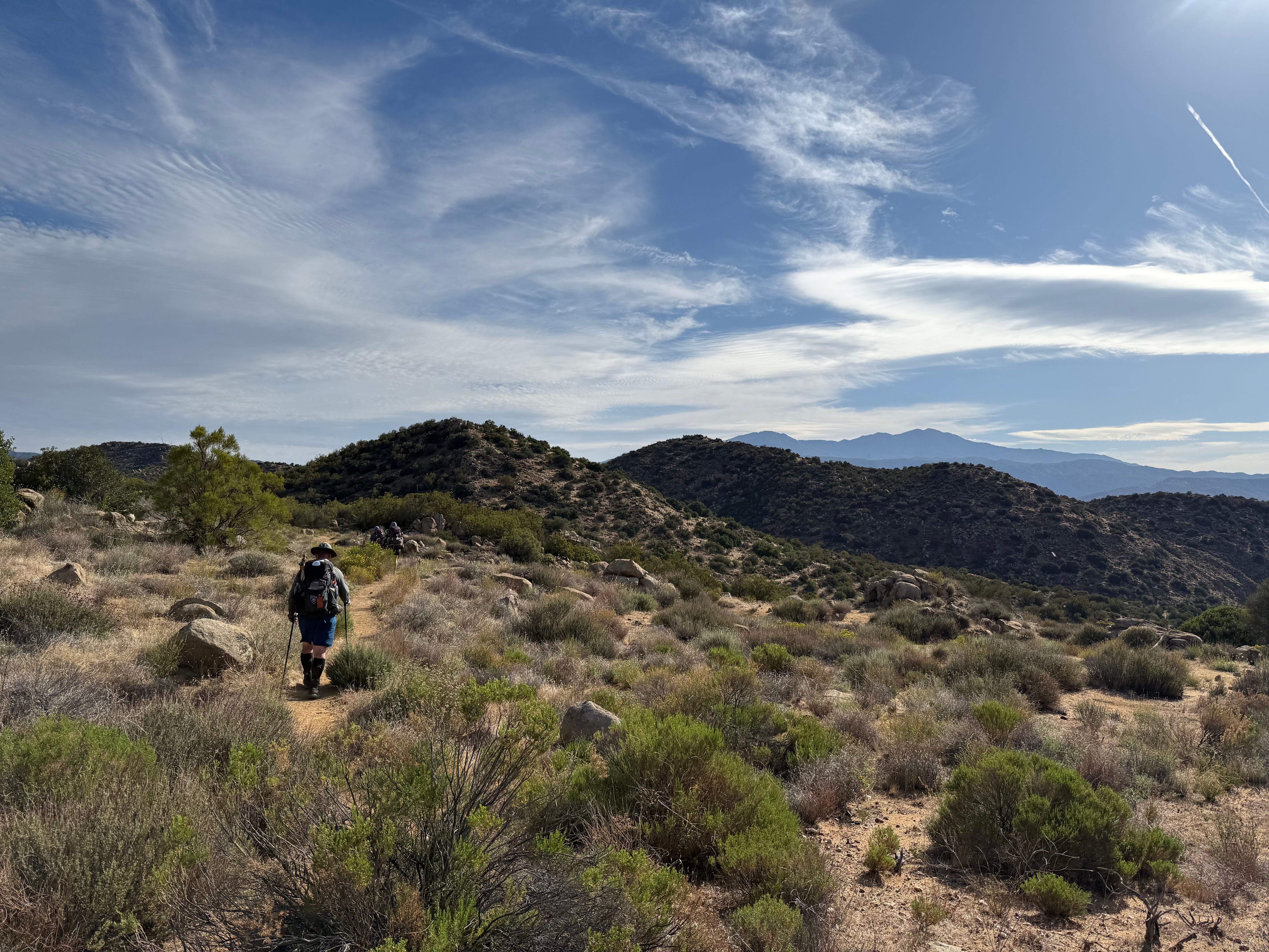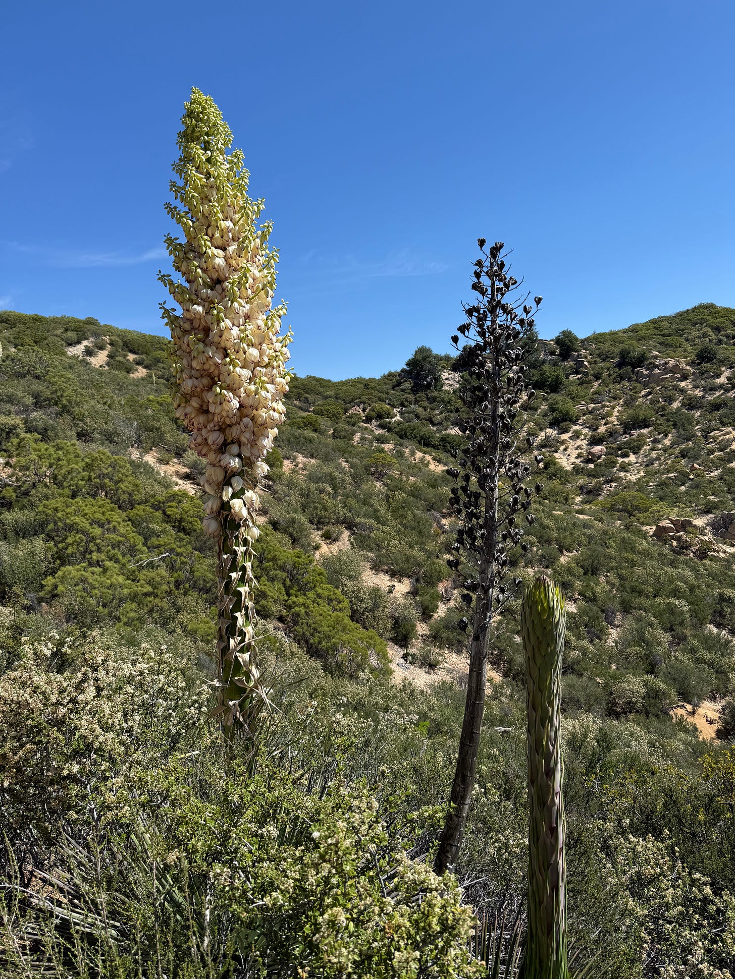 These sections have been remarkable, with a wide range of ecosystems and terrain in rapid succession. We started in rolling grasslands and oak woodlands, where the trail wound through the arid chaparral of the San Felipe Hills and the high desert expanses of the Anza-Borrego. Flora highlights were coast live oak, manzanita, and yucca with their flowers in all three stages (pre, during, and post-bloom).