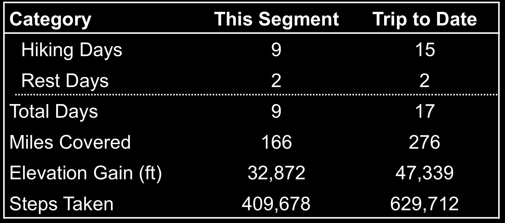 * Overall mileage will diverge from where I am on the trail as I complete side quests to peaks and other points of interest.