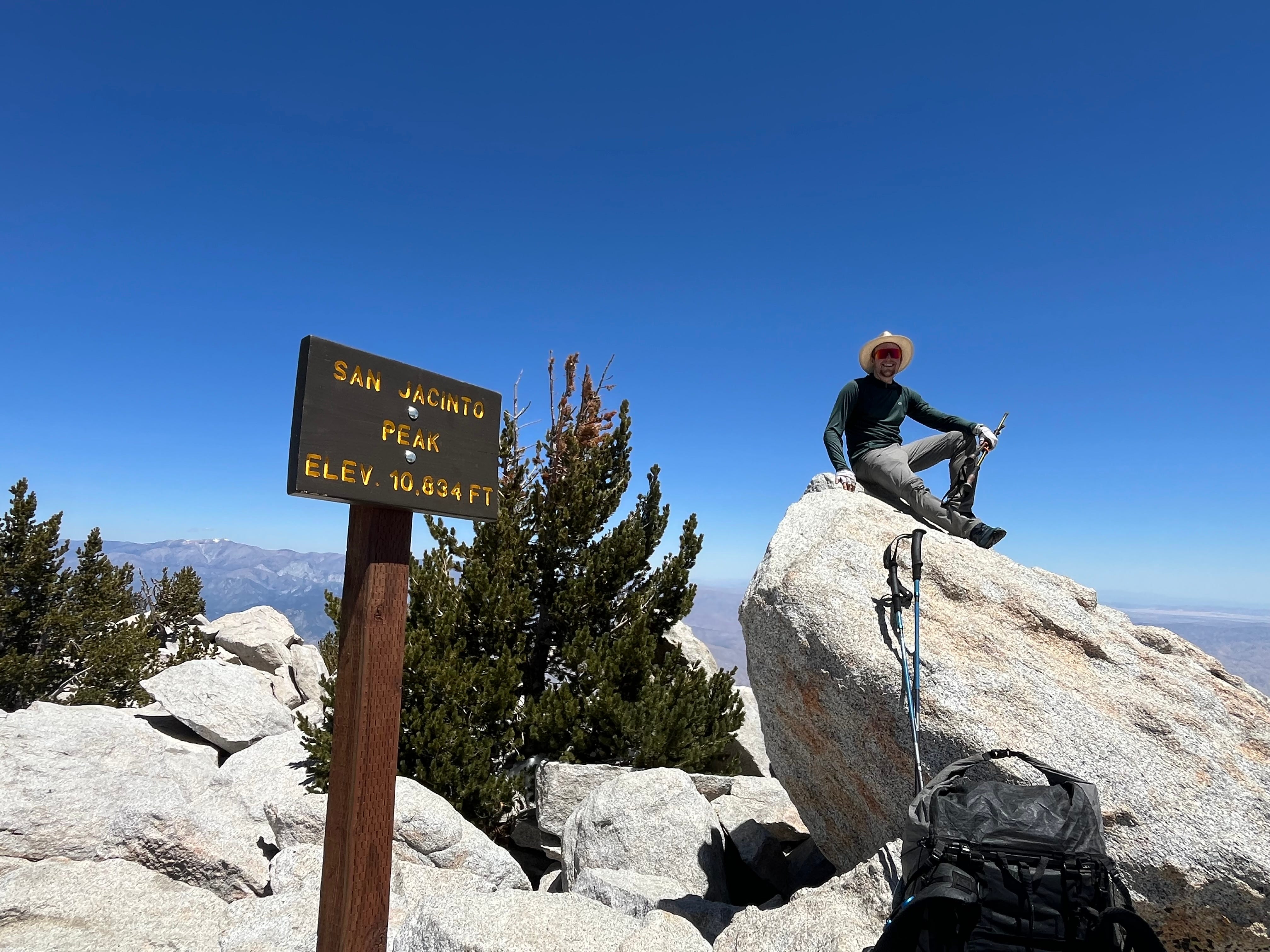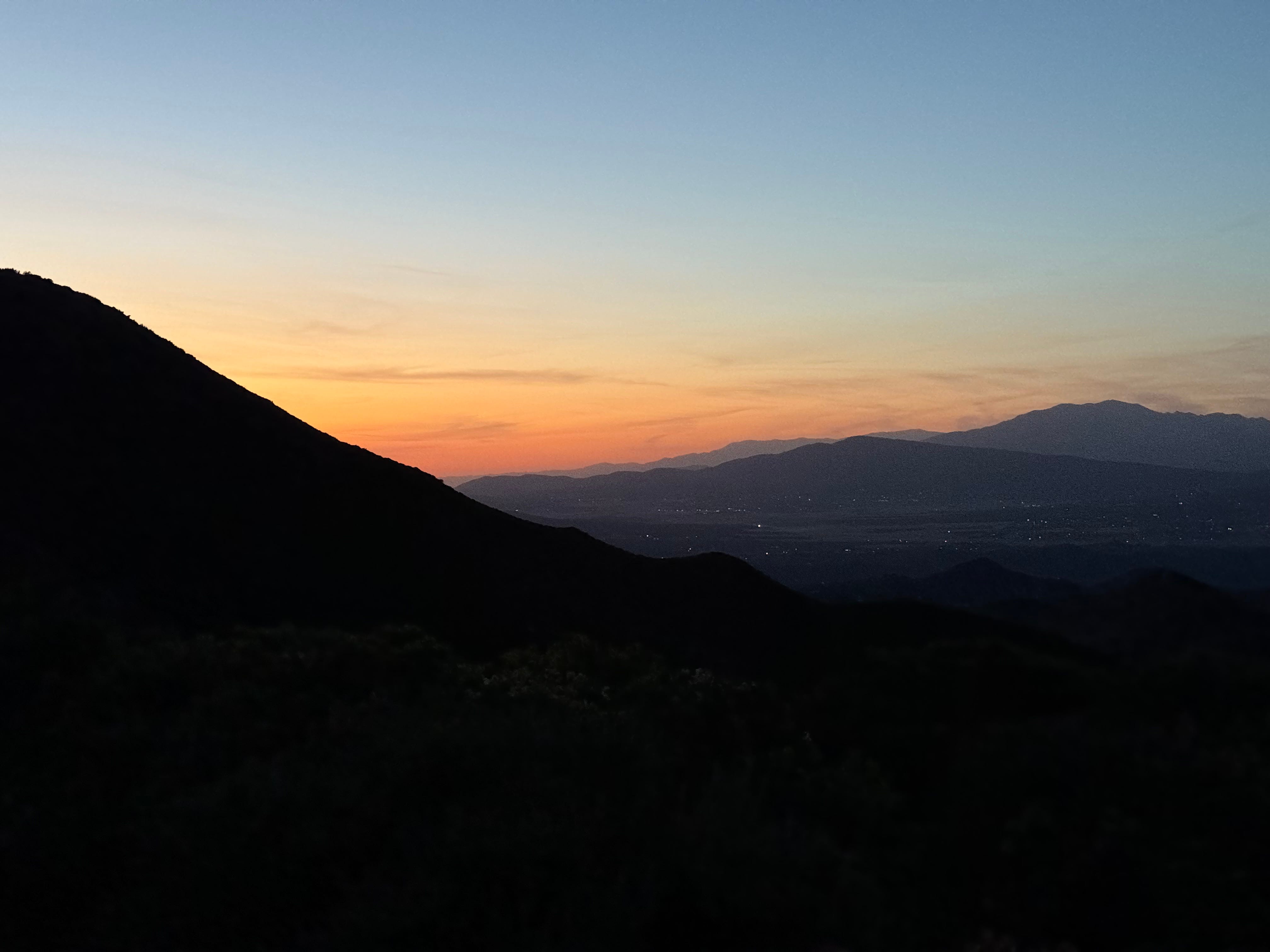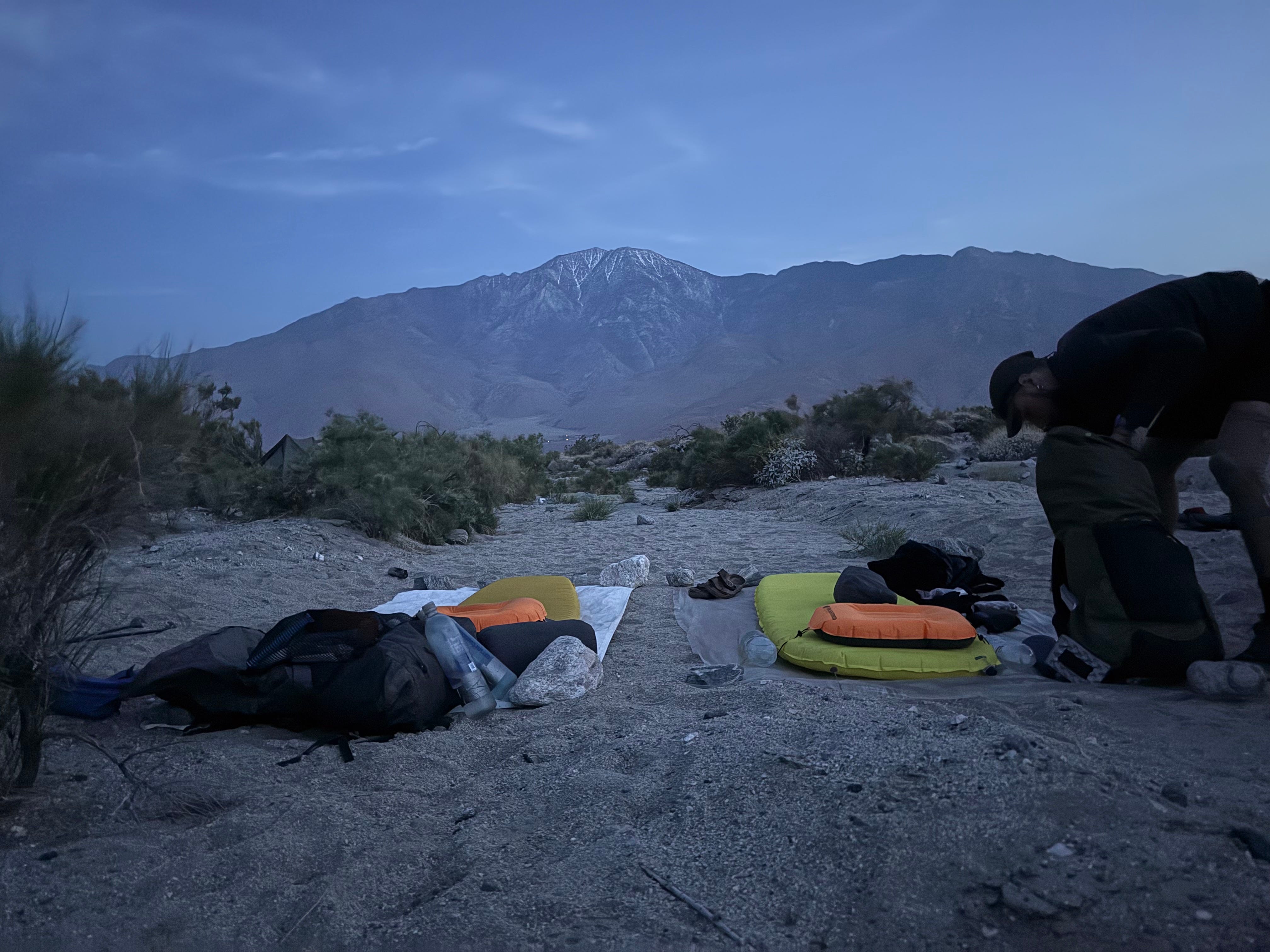 Afterward, we got a hitch back up the base of the mountain and then ascended 6,000 feet to the peak of Mount San Jacinto. After the summit there was a steep descent into San Bernardino National Forest. We went from nearly 11,000 feet down to just 1,100 feet in under 30 miles of trail (and my knees took note). At the bottom we crossed underneath I-10, passing through the hiker haven, and I introduced a few of our international friends to In-N-Out (double-doubles, animal style of course). With more wind in the forecast, we cowboy camped under the stars that night, treated to a direct view of the snowy peak we’d been at the top of just 36 hours earlier.