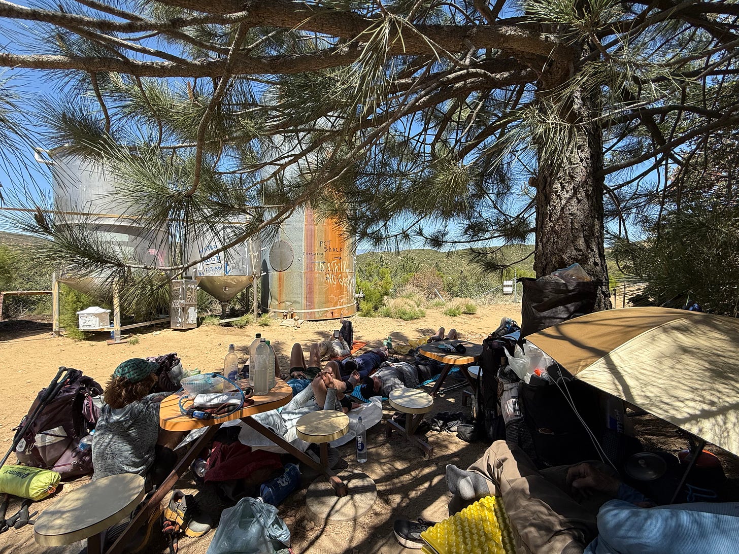 By 11 am, most hikers had found their way to “Mike’s Place”, the property of a local trail angel complete with water tank that prevented what would otherwise be a 40 mile water carry. Situated immediately opposite the tank on the other side of a dirt road sat a lone pine tree, under which Mike had erected a few small tables and benches. No less than 20 of us huddled underneath this tree waiting out the mid-day heat, some having to shift every hour or so with the changing shade.