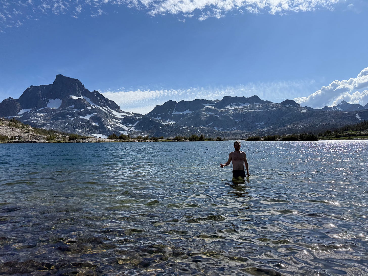 The trail continued through beautiful forests of the High Sierra in both the Ansel Adams and John Muir Wilderness areas. We climbed to a ridge and then walked through a meadow for miles, treated to views of the famous Minarets, with Mount Ritter and Banner Peak also close by. With the weather getting slightly warmer below 10,000 feet we began to make it a habit of camping and eating all of our meals at alpine lakes, taking an obligatory dip in each.