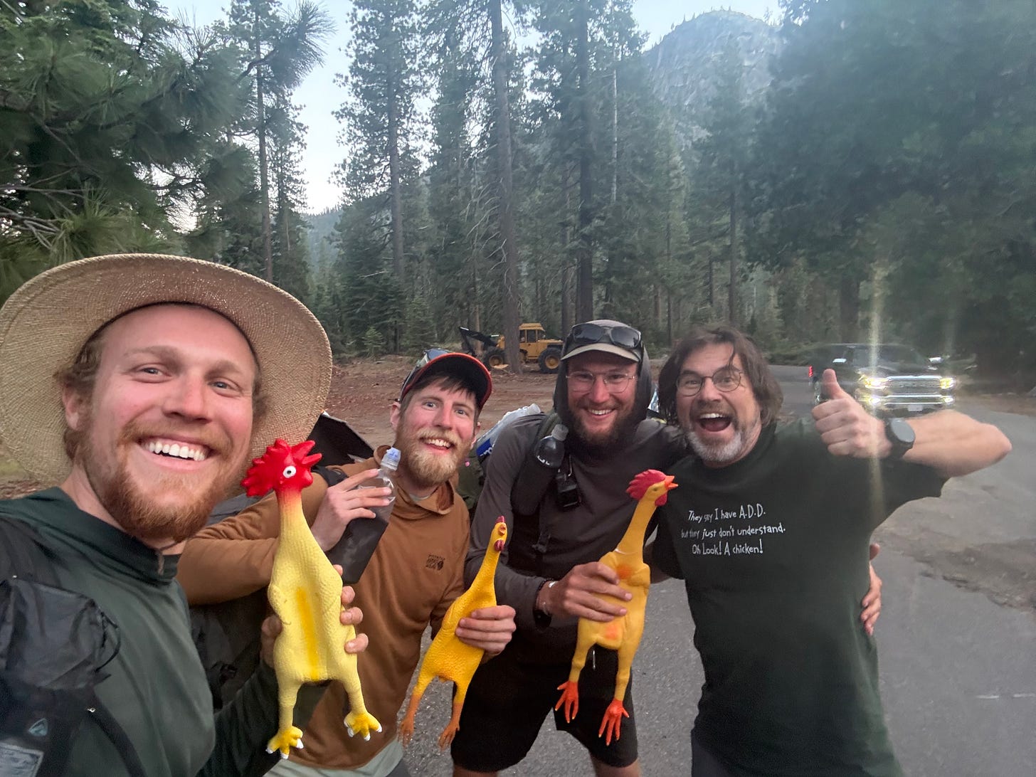 Heading out, with the sun about to set, we were really gambling on someone coming over the mountain pass to pick us up. As soon as we got to the main road and put our thumb up, the first car stopped short before backing up onto the side road. An eccentric, grizzled man hopped out and emptied the backseat to make room for the three of us. I immediately noticed there was a rubber chicken on the back of his bike and then once I got into the car, saw full-sized rubber chickens in each seat and a small rubber chicken in the AC vent. We didn’t know how lucky we were to have been picked up by Hans, “The Chicken Man of Silicon Valley,” on his way to complete his 15th consecutive “Death Ride,” a 103 mile bike race with more than 14,000’ of climbing.