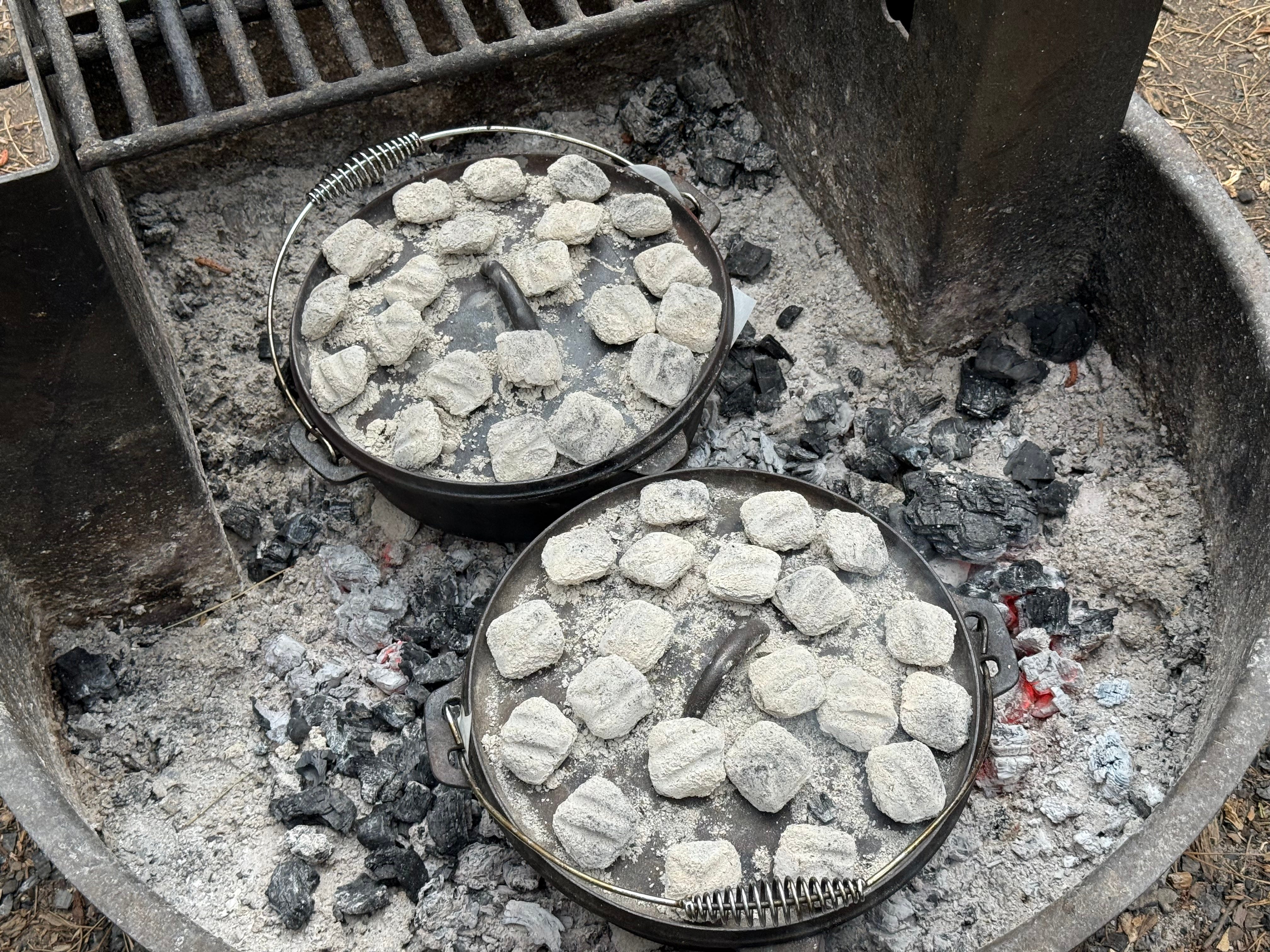 The group’s love language is definitely food. Linda (the head chef) flies in two days before each trip, renting an Airbnb with a suitable kitchen just to prepare for all the meals. Mark is the designated mixologist, making craft cocktails each night, strong and on theme. They crowdsource recipes and produce everything from homemade power bars to grits and gumbo. Their signature course may be dessert, where they prepare cakes and pies in cast iron Dutch ovens that are then covered in exactly 32 hot coals: 21 on top, 11 underneath. Linda meticulously organizes every meal in a spreadsheet (a woman after my own heart) and the jobs of cooking and cleaning are allocated on a rotating basis.