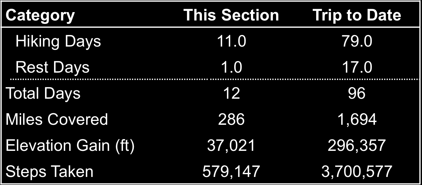 The conversation rolled on like this for hours until we arrived at camp just before 9. I pretty much collapsed into my tent after 36 miles, my longest day thus far. Peg Leg seemed just fine, having completed 39 without issue. We invited her to eat dinner with us but disciplined and knowing it’s in her best interest to recover horizontally, she turned in shortly thereafter. I made sure to go over and thank her for hiking with us and remind her that’s she’s a badass, surely something she already knew. She said it was great hanging with us too and we wished each other luck. By the time I got up the next morning, she was long gone, never to be seen again. We were just three of hundreds of hikers who were giddy at the prospect at being a small part of her journey and is now the ultimate name drop I can use around hiking nerds. If successful, she will be the second person and first woman to complete the B2BCYTC, placing her amongst the most decorated thru hikers of all time.