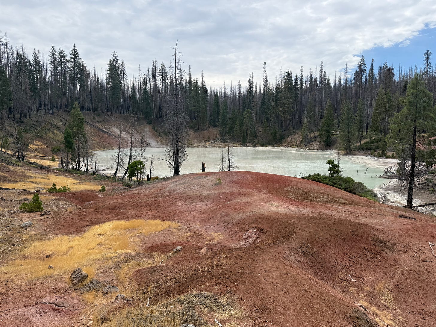 As seems to happen often, I found myself behind the 8-ball coming out of Chester. I got a ride to the trail at 9 pm after a very nice gentleman proactively offered to take me, potentially worried about me as I sat on the sidewalk outside the grocery store defiling the carcass of a rotisserie chicken (the only hot meal available at that hour). After camping alone under a sea of widowmaker trees that night, I started towards Lassen Volcanic National Park, knowing I had to hike my longest day yet in order to catch up with my group and evade the park’s stringent food storage requirements. Along the way we were treated to a number of geological wonders showing active volcanic activity in and around Mt. Lassen. First was the Terminal Geiser and then Boiling Springs Lake. All the rocks around seemed porous and often the landscape seemed like it would be better suited for Mars, crazy considering it was often surrounded by tall green pines and firs.
