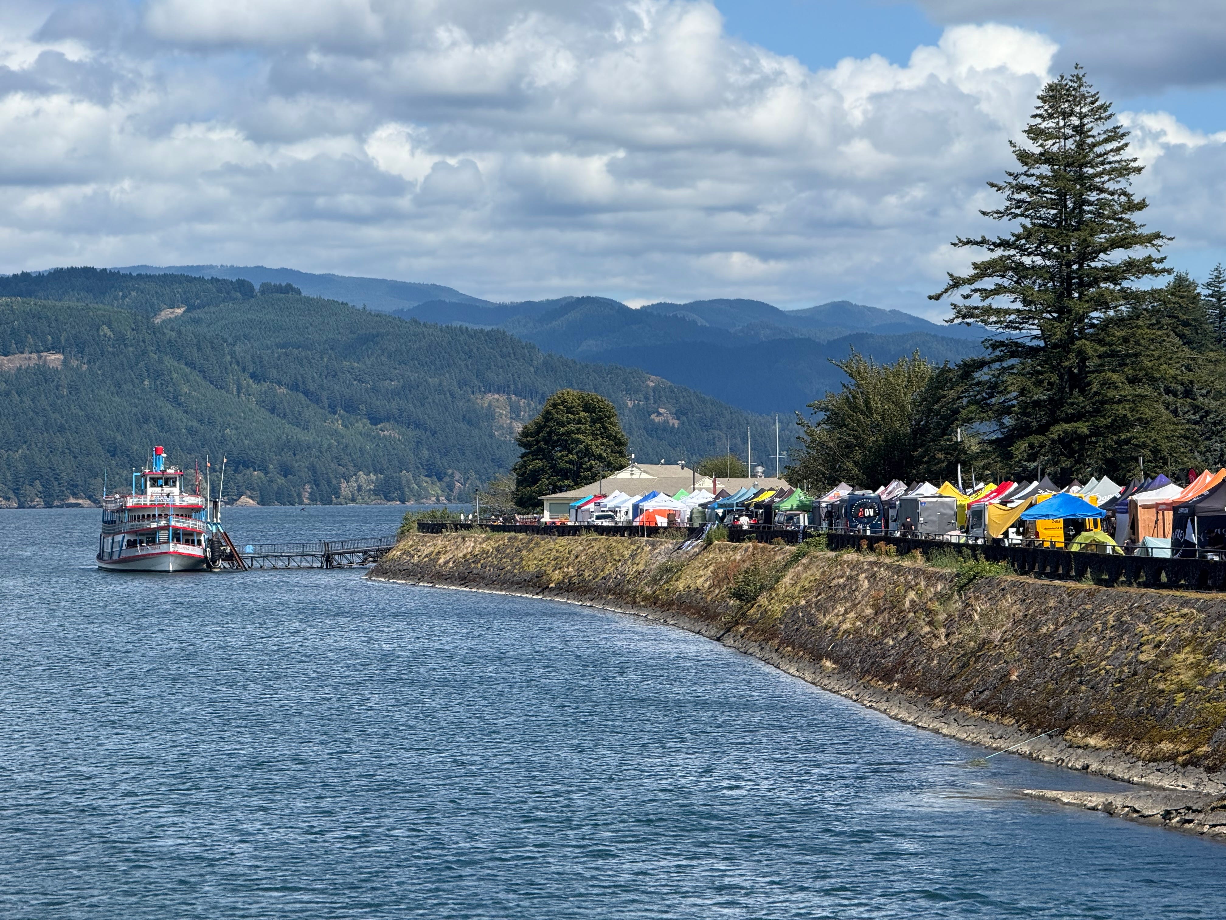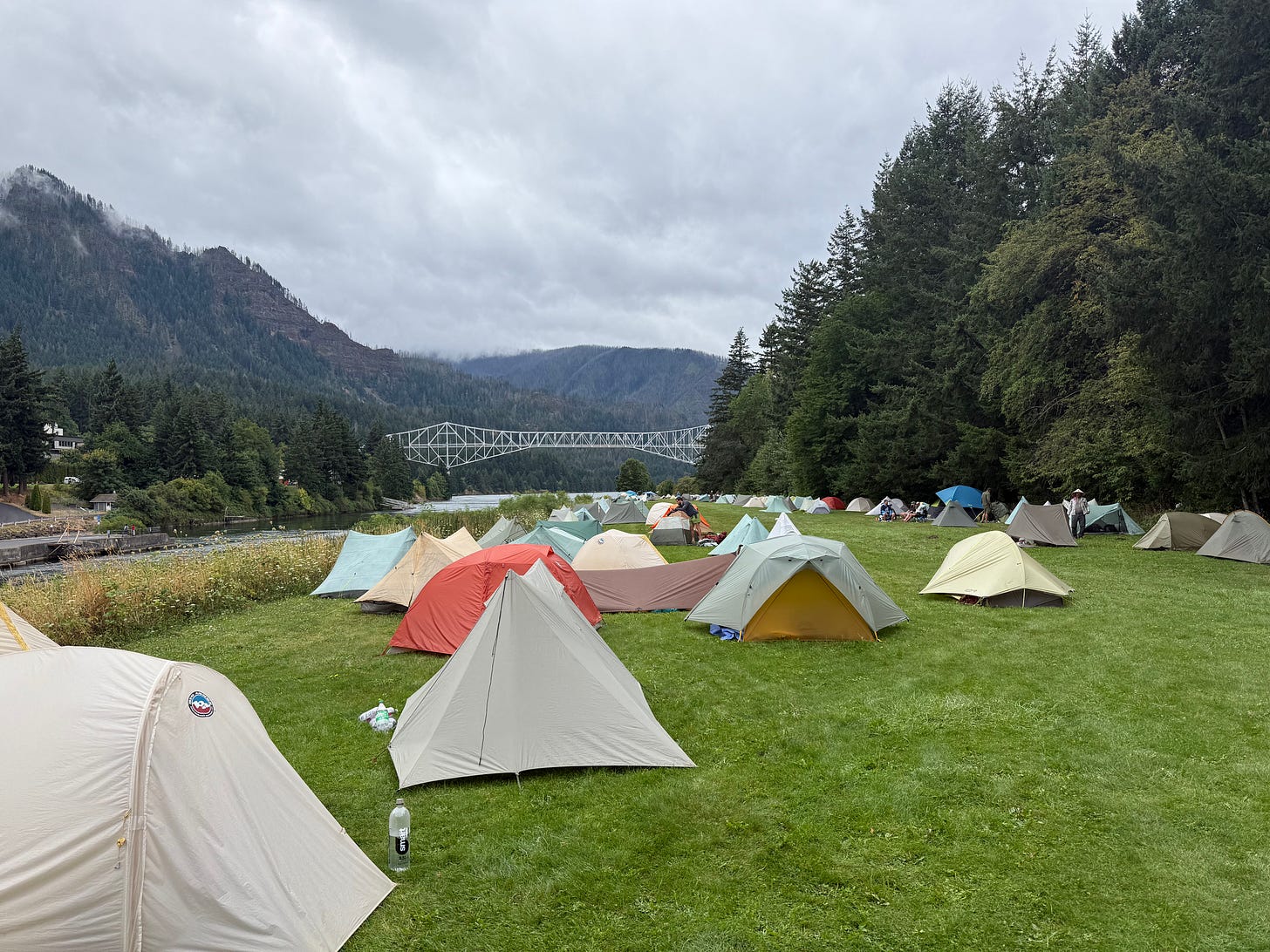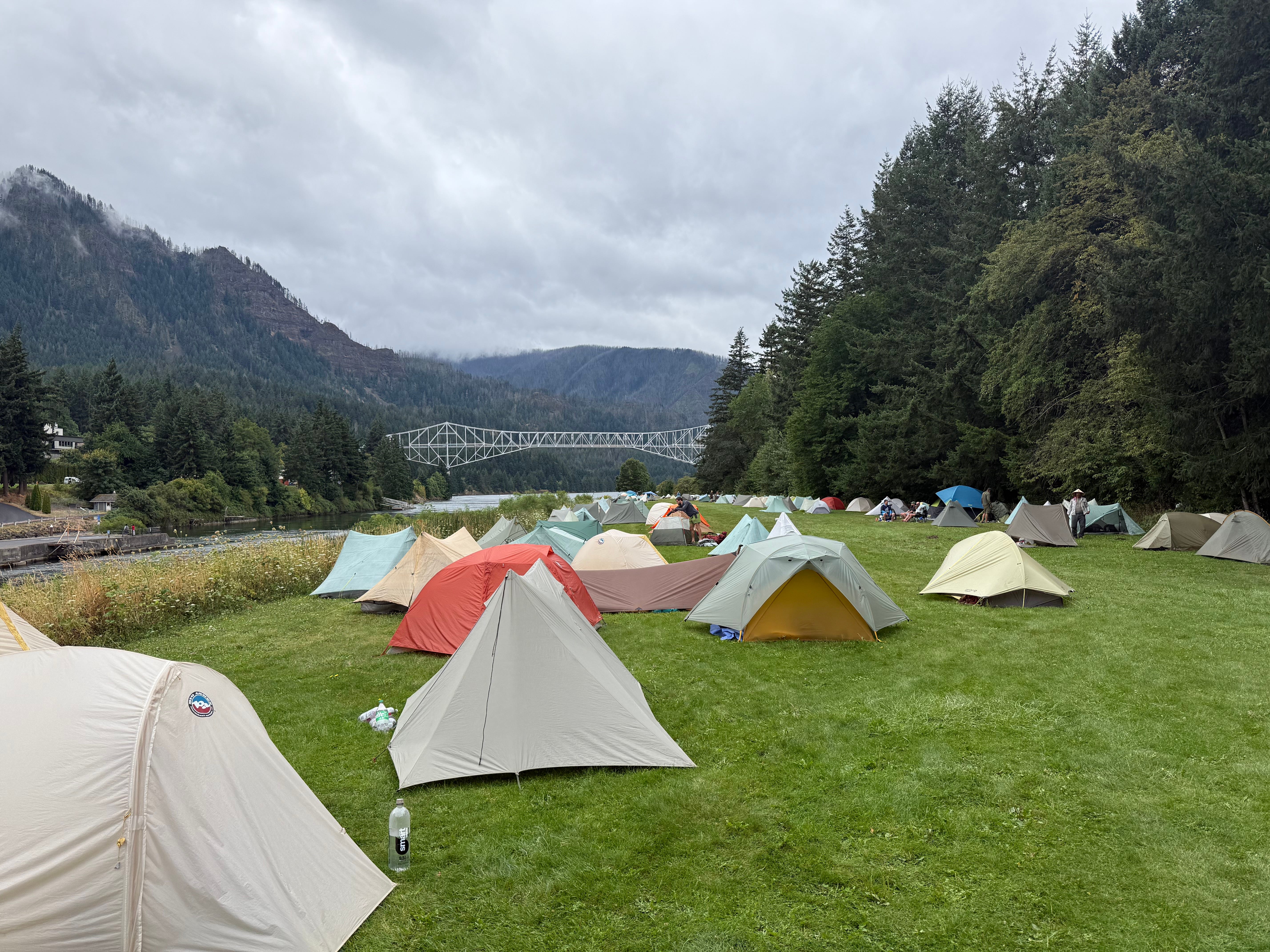 We said goodbye to John and hiked two more days to Fish Lake where we were met by our friend Ari who got off trail in Truckee but came up to drive us to PCT Trail Days in Cascade Locks, OR along the Columbia River. The towns along the river are beautiful, hip, and waiting to be discovered. A highlight was the bouldering gym built into a 19th century church, complete with all its original stained glass. Once at the festival, we pitched our tents among the 400+ on Thunder Island, practically at the base of the Bridge of the Gods which we’ll pass over when we cross into Washington.